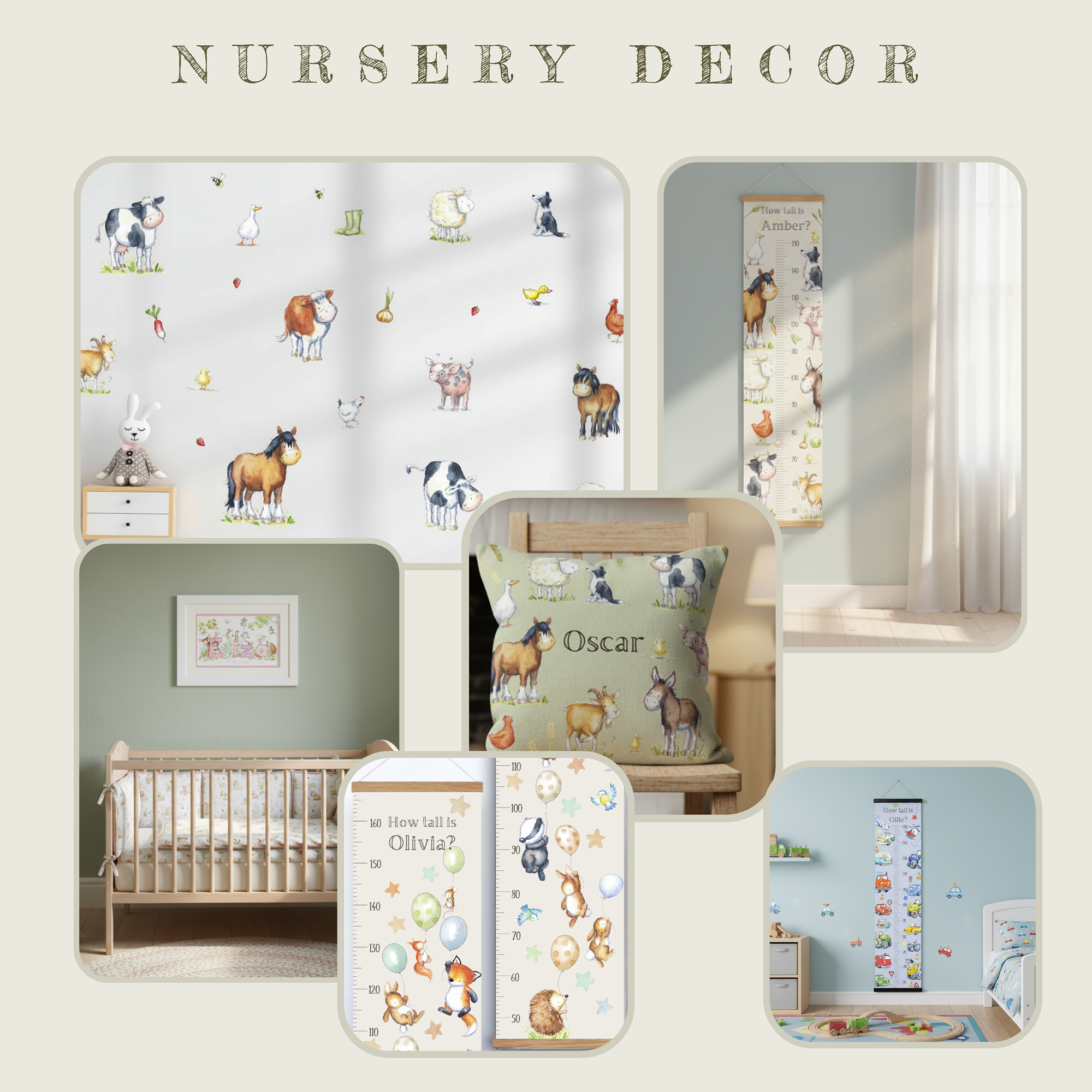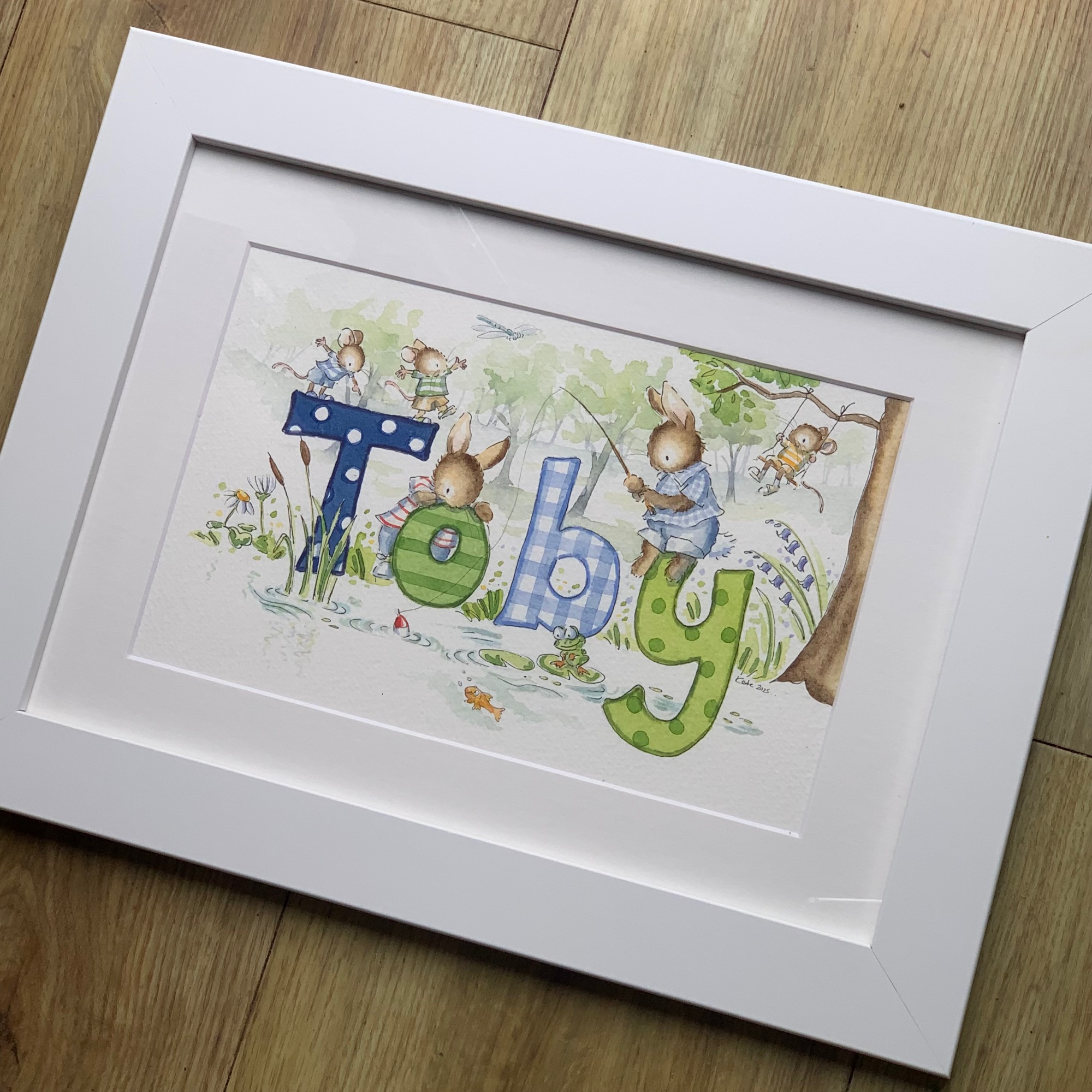 Each name painting is individually desinged for you, and can include bespoke elements such as pets, family members, or special places.