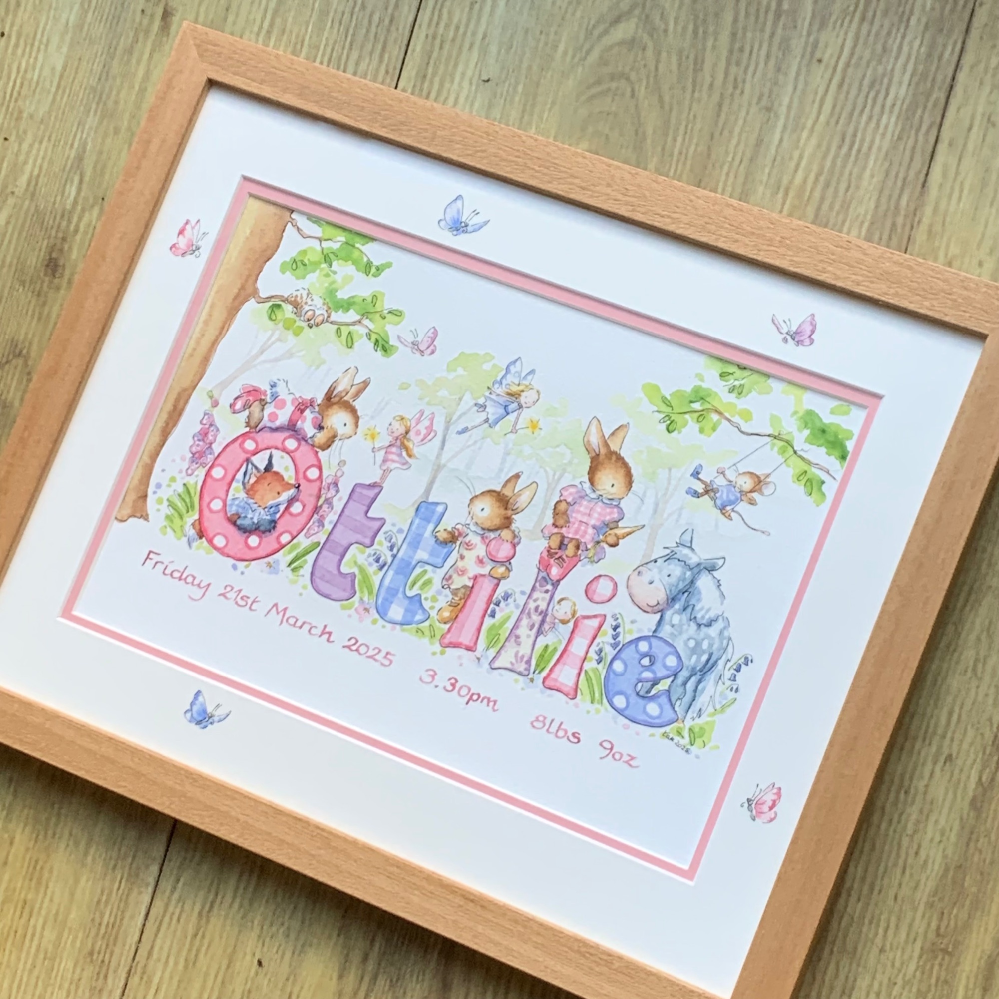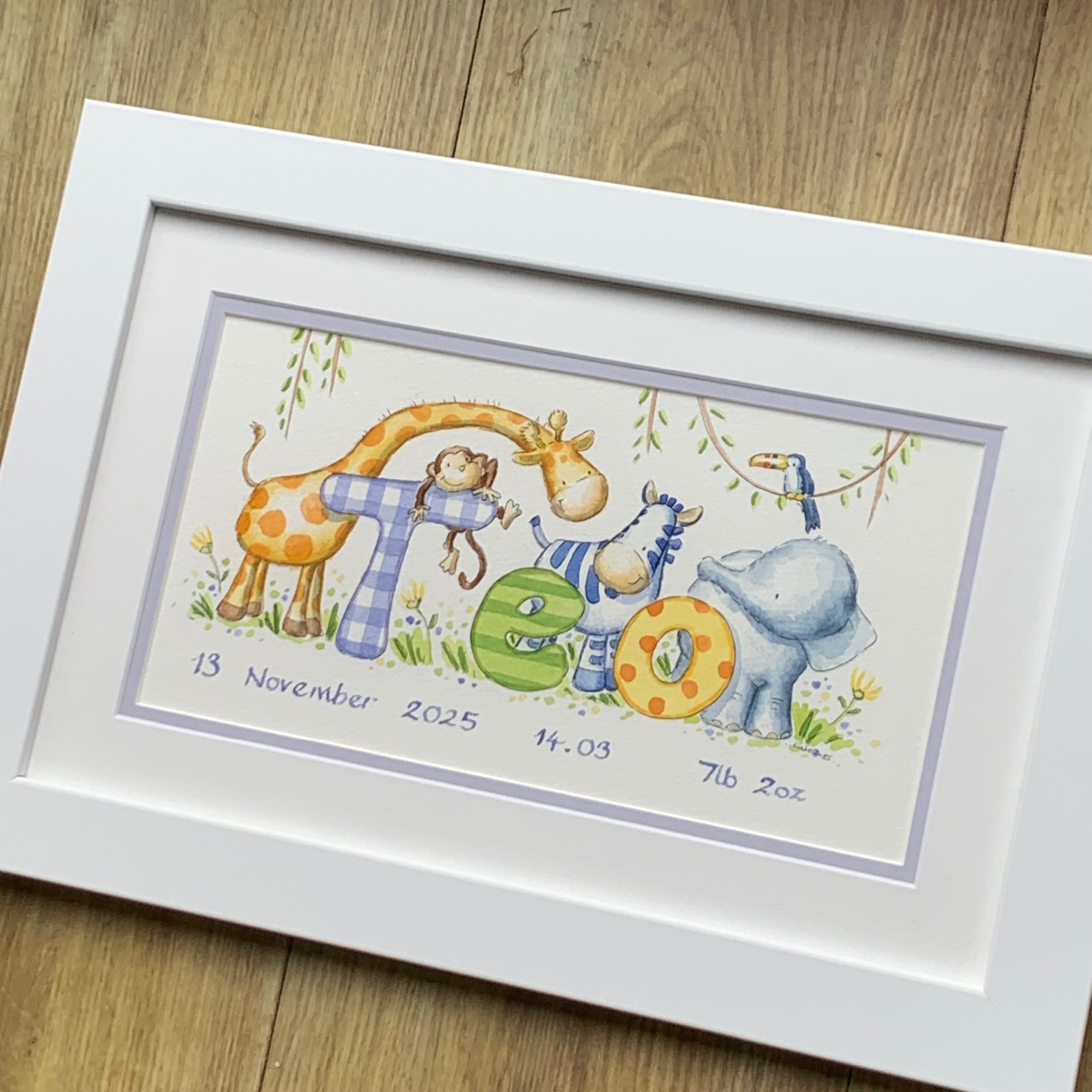 This is the second framed baby name picture we’ve ordered for my Grandchildren and I’m so pleased with them both. They’re so well painted imaginative and original. I also very much appreciated the personal contact we received to make sure the picture was just what we wanted it even included a likeness to our own dog.