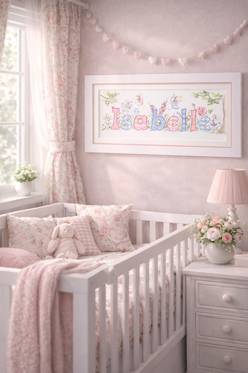Tiny fairies hover above letters, perch upon petals or scatter a little sparkle across the page. Their expressions are sweet and playful, perfectly suited to a classic baby girl’s nursery.