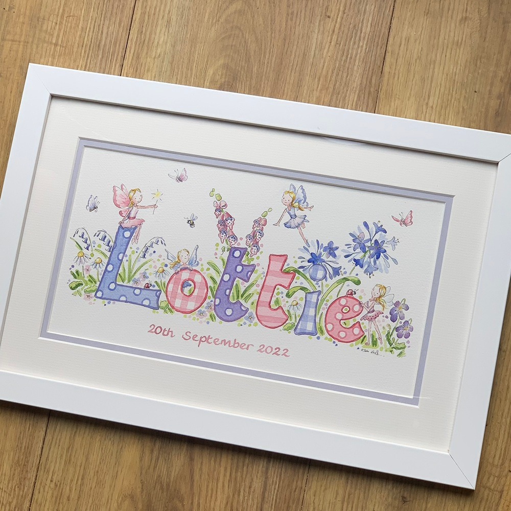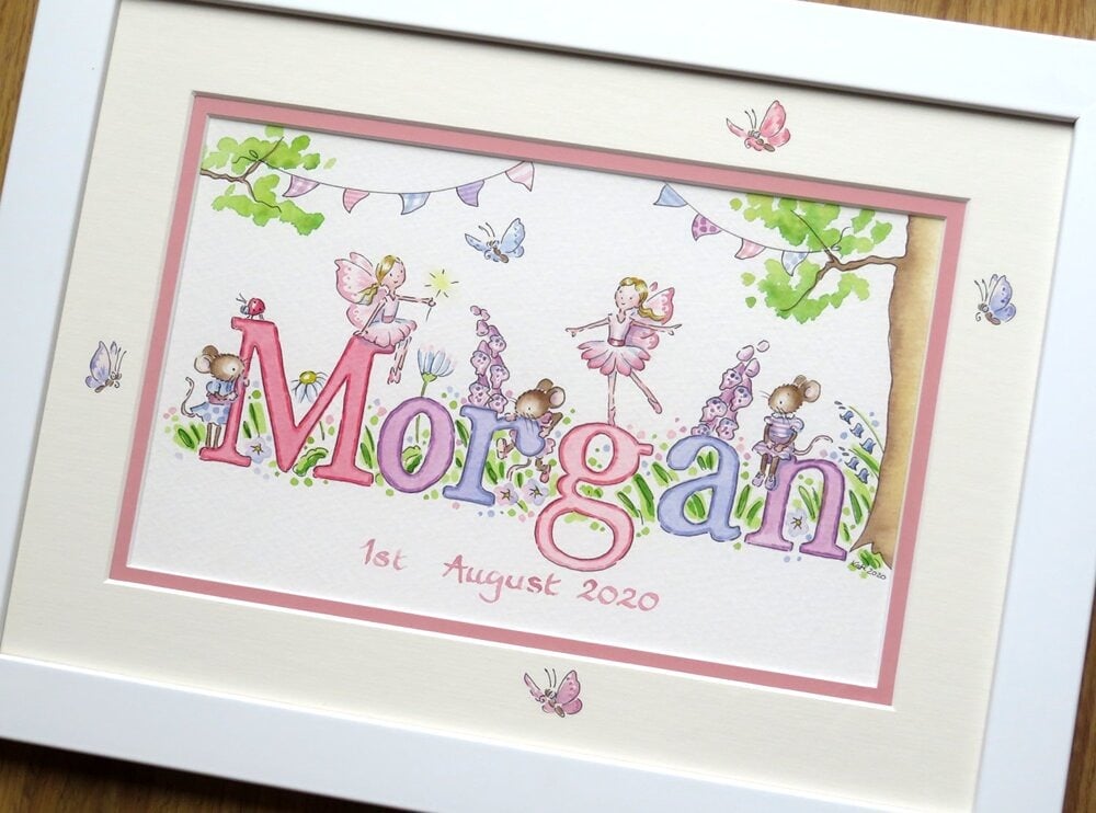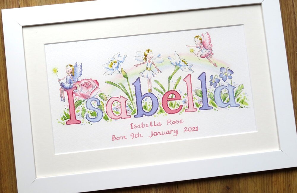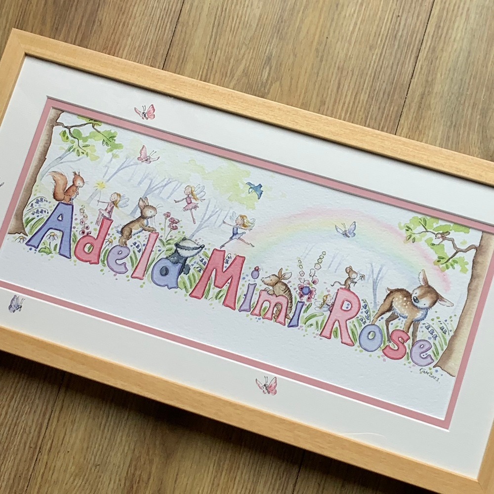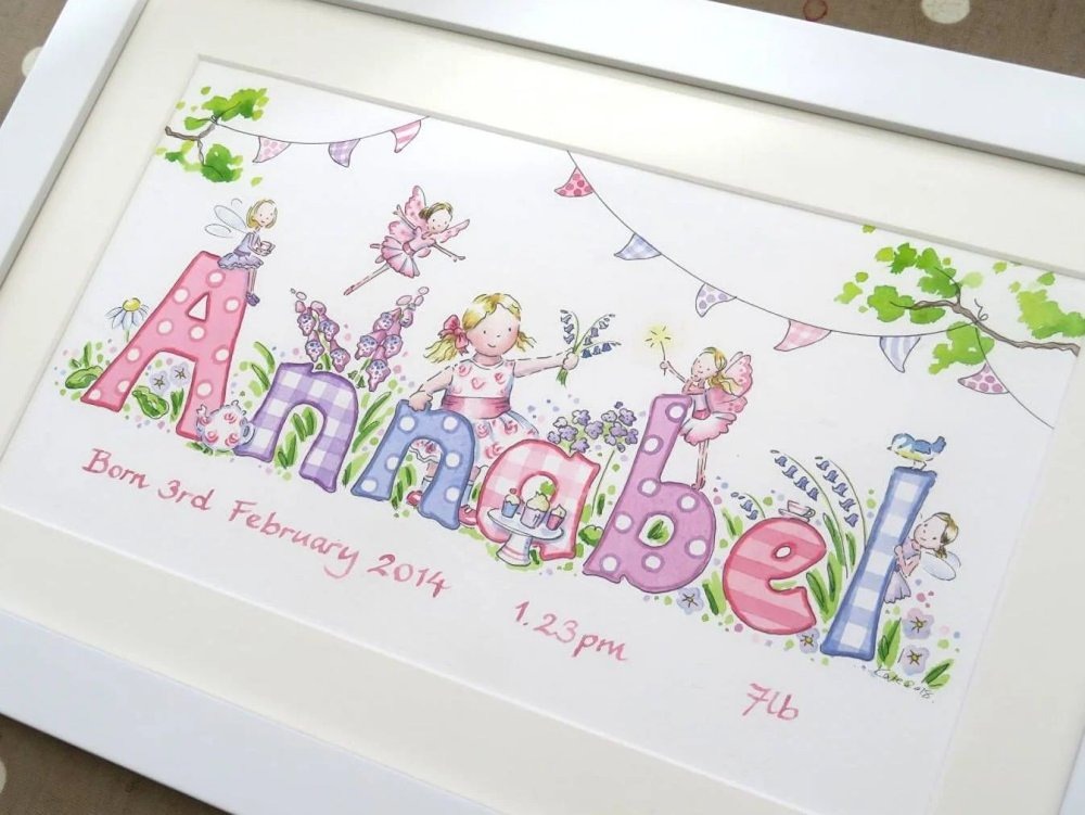 Each design is created in delicate watercolour, with your child’s name woven among blossoms, butterflies and gentle fairy figures. The result is a bespoke keepsake — feminine, joyful and made to be treasured.