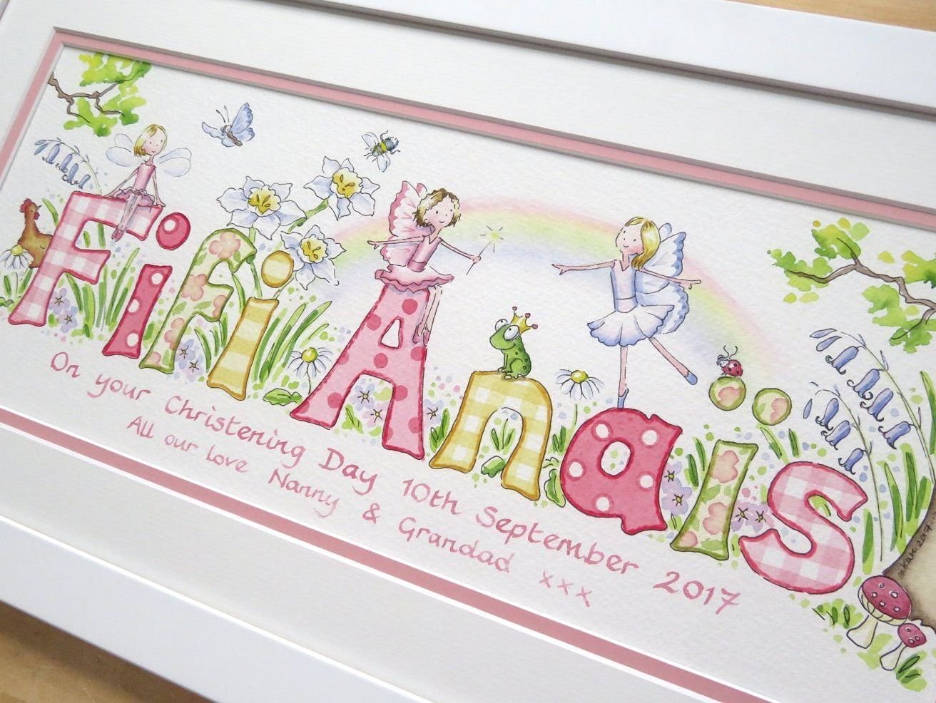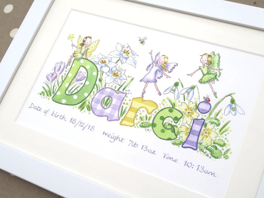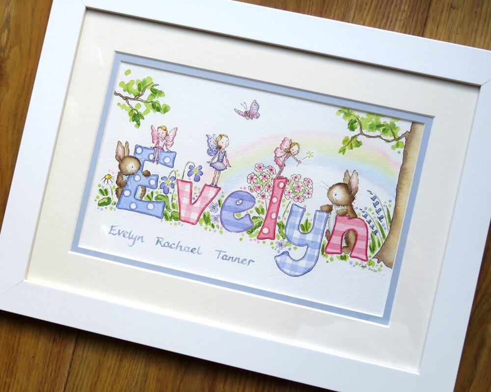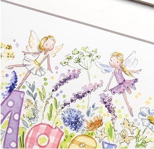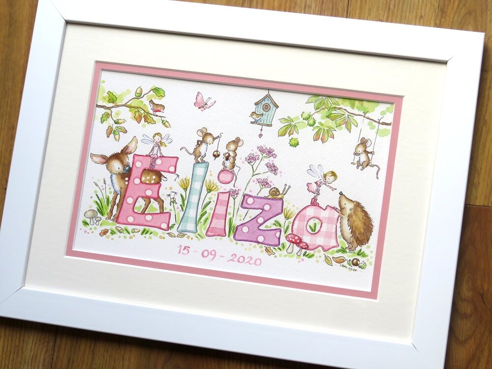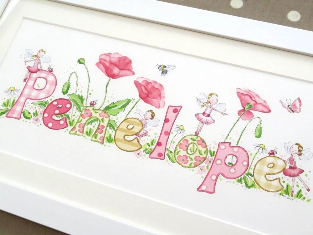 Each design is created in delicate watercolour, with your child’s name woven among blossoms, butterflies and gentle fairy figures. The result is a bespoke keepsake — feminine, joyful and made to be treasured.