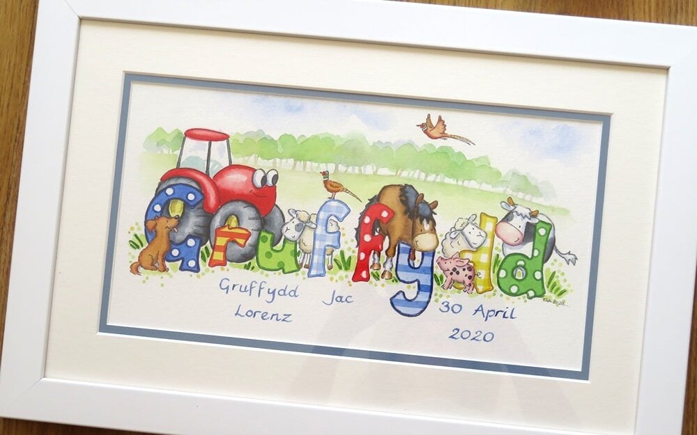 No two farm animal name pictures are ever identical. Colours can be softened to suit your nursery palette. Animals can be added or rearranged. Dates, birth details and small personal touches may be included beneath the name.