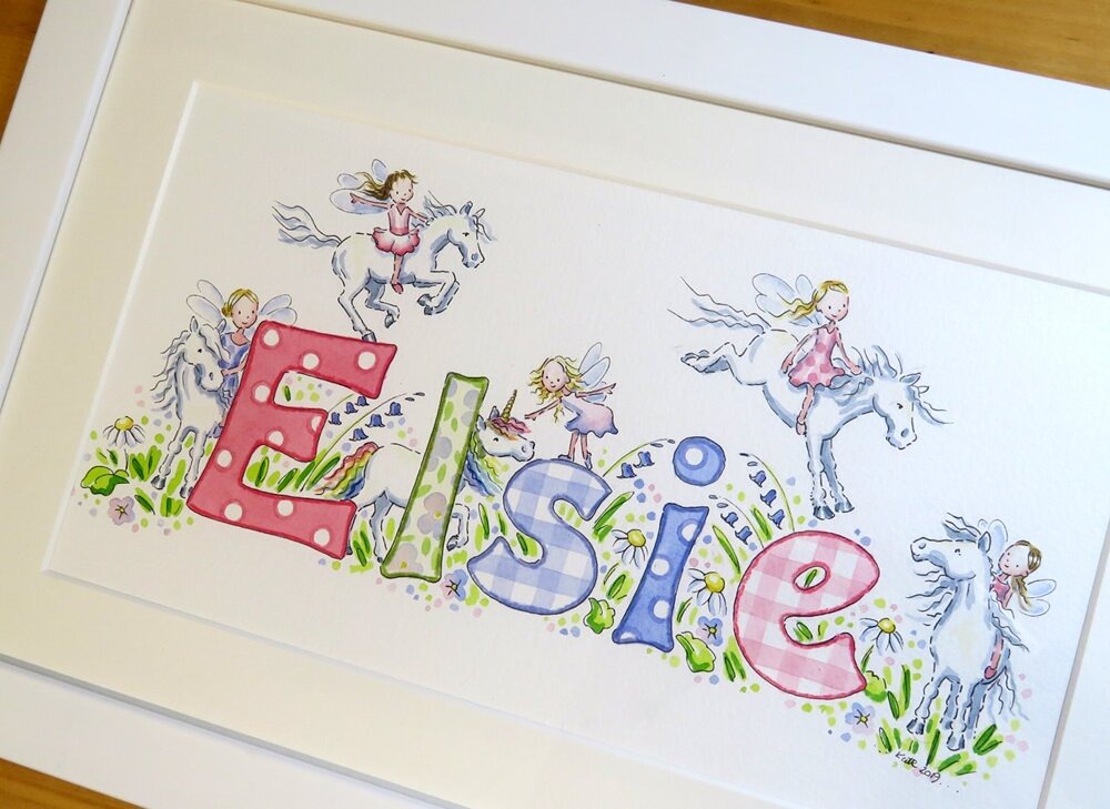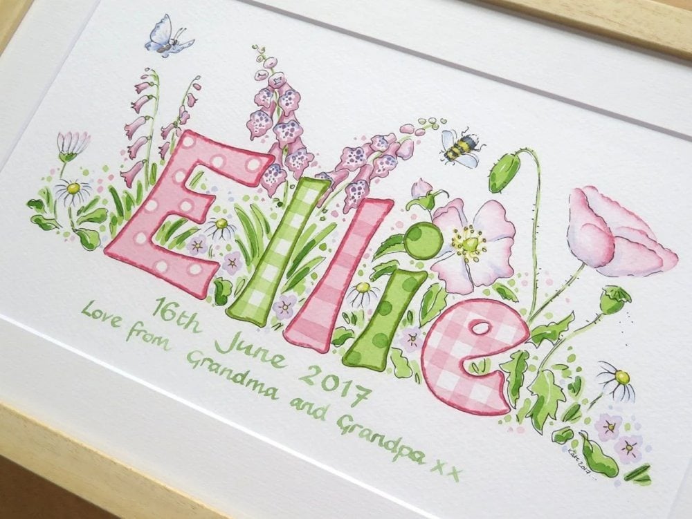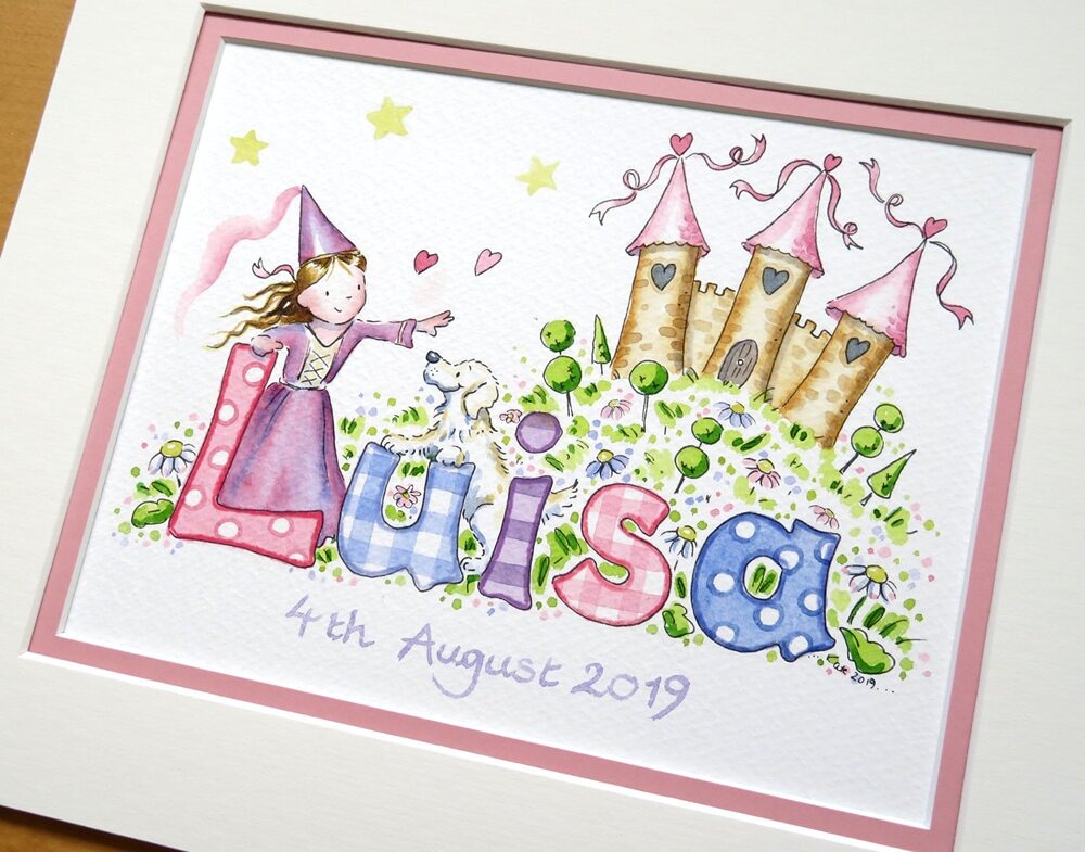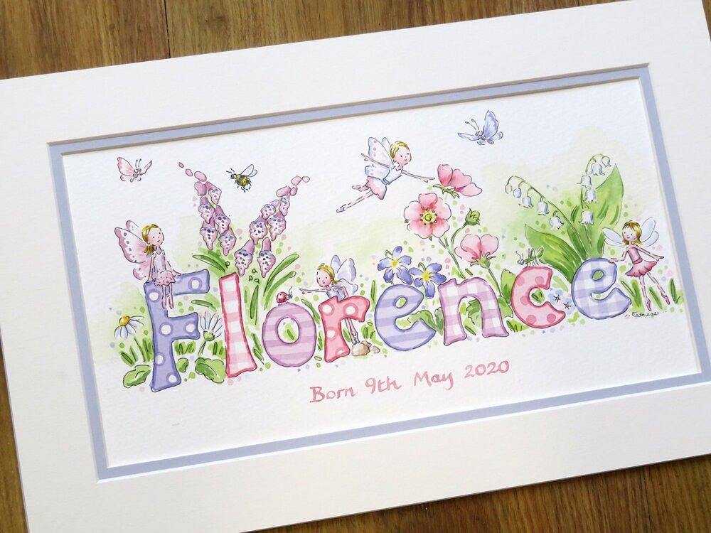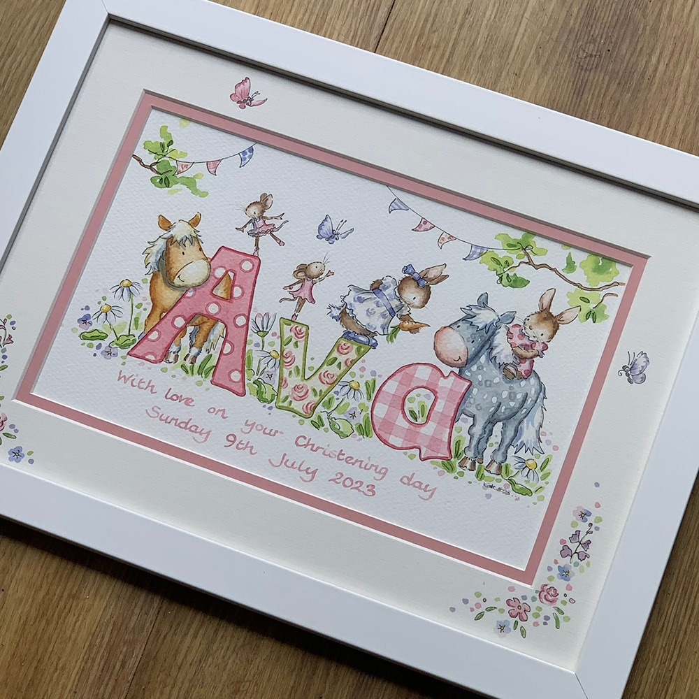 Choosing a design for your little girl’s name painting should feel like turning the pages of a favourite storybook. Each illustration begins with your ideas and is lovingly hand painted in my Devon studio, creating a unique baby gift that will be treasured for years to come.