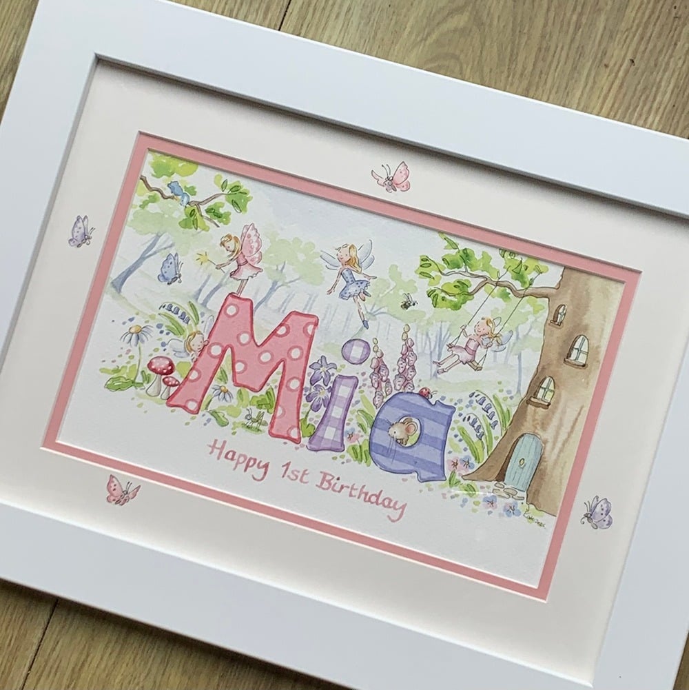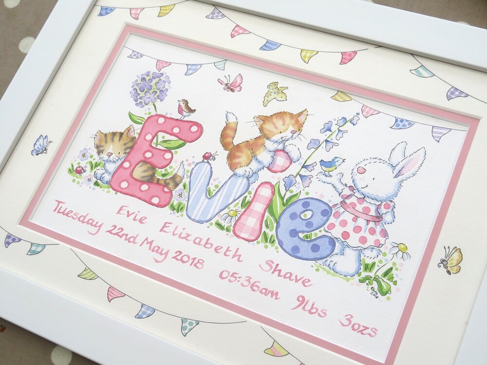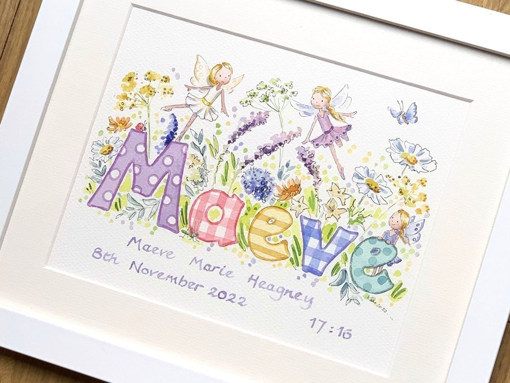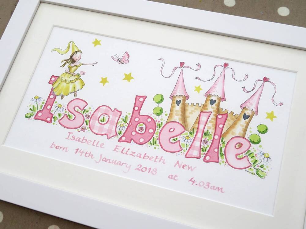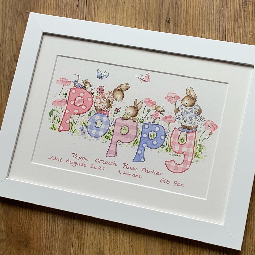 Choosing a design for your little girl’s name painting should feel like turning the pages of a favourite storybook. Each illustration begins with your ideas and is lovingly hand painted in my Devon studio, creating a unique baby gift that will be treasured for years to come.