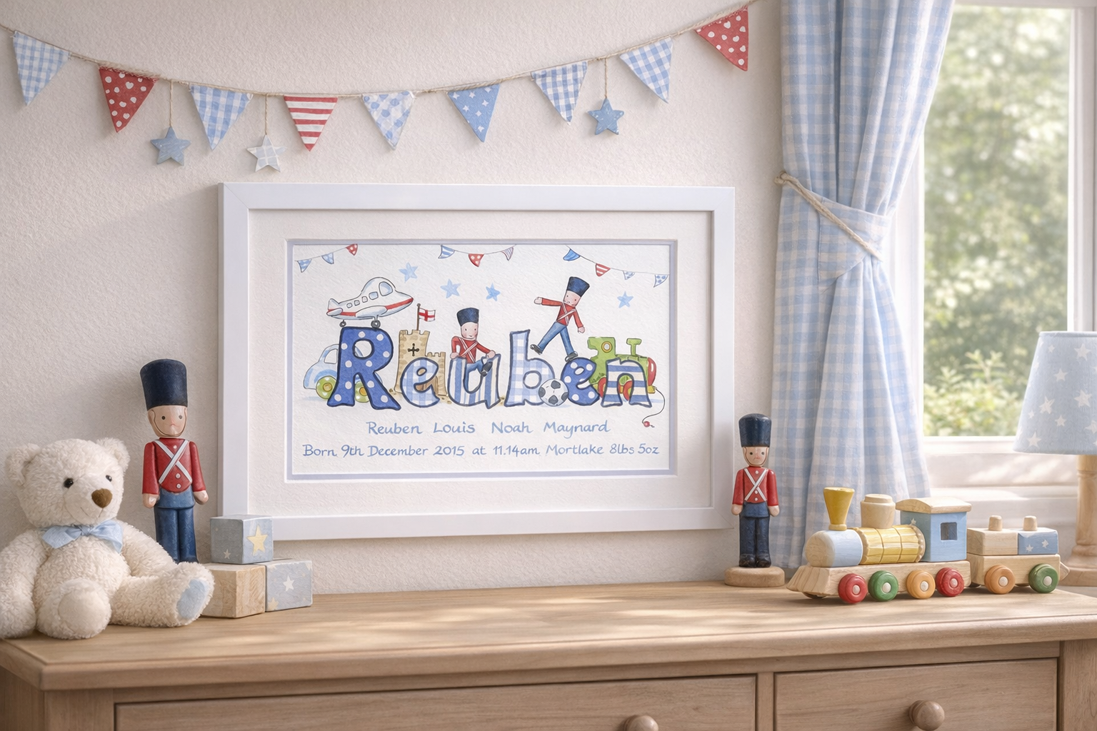 Because the artwork is drawn and painted by hand, each design carries a gentle traditional charm — full of character, colour and small expressive details. These illustrations are then used across the nursery décor pieces, allowing parents to build a coordinated theme using artwork that comes from a single artist’s hand.