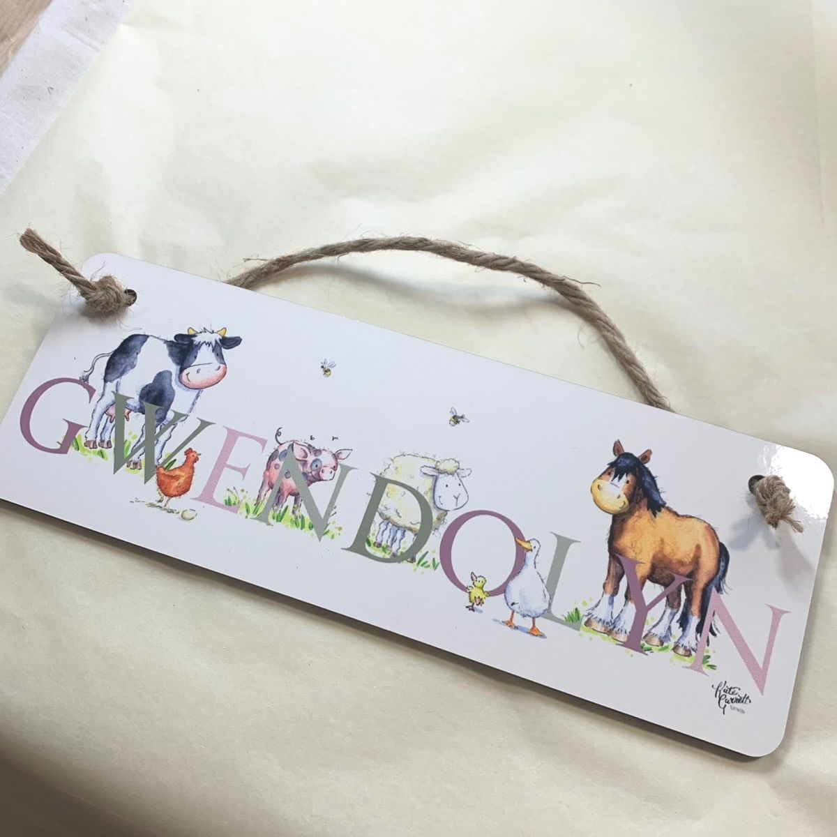 - Personalised farm animal door sign for girls featuring Kate Garrett’s original illustrations. A charming farm themed nursery or bedroom door plaque.