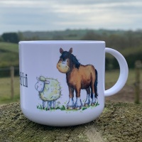 - A practical unbreakable mug for toddlers, personalised with a child’s name and illustrated with gentle farm animals — made for everyday use.