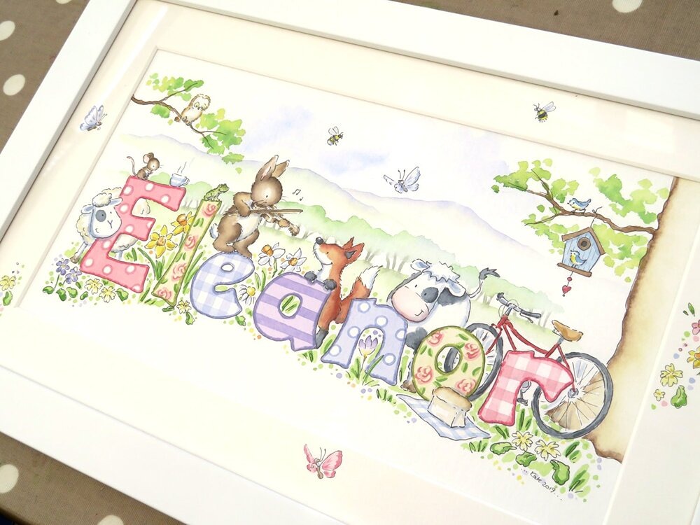 Siblings can peek from behind the letters. A beloved dog might sit proudly beside the final character. A family pony, farm animal or even a favourite cat can be woven gently into the scene.