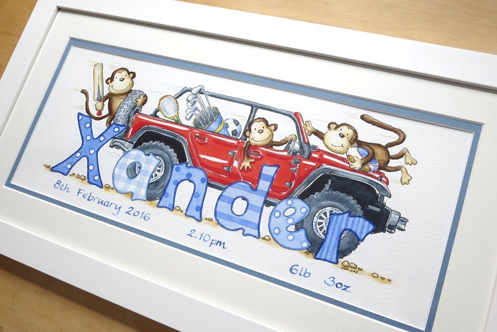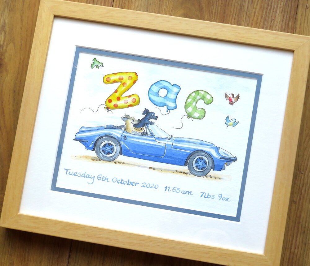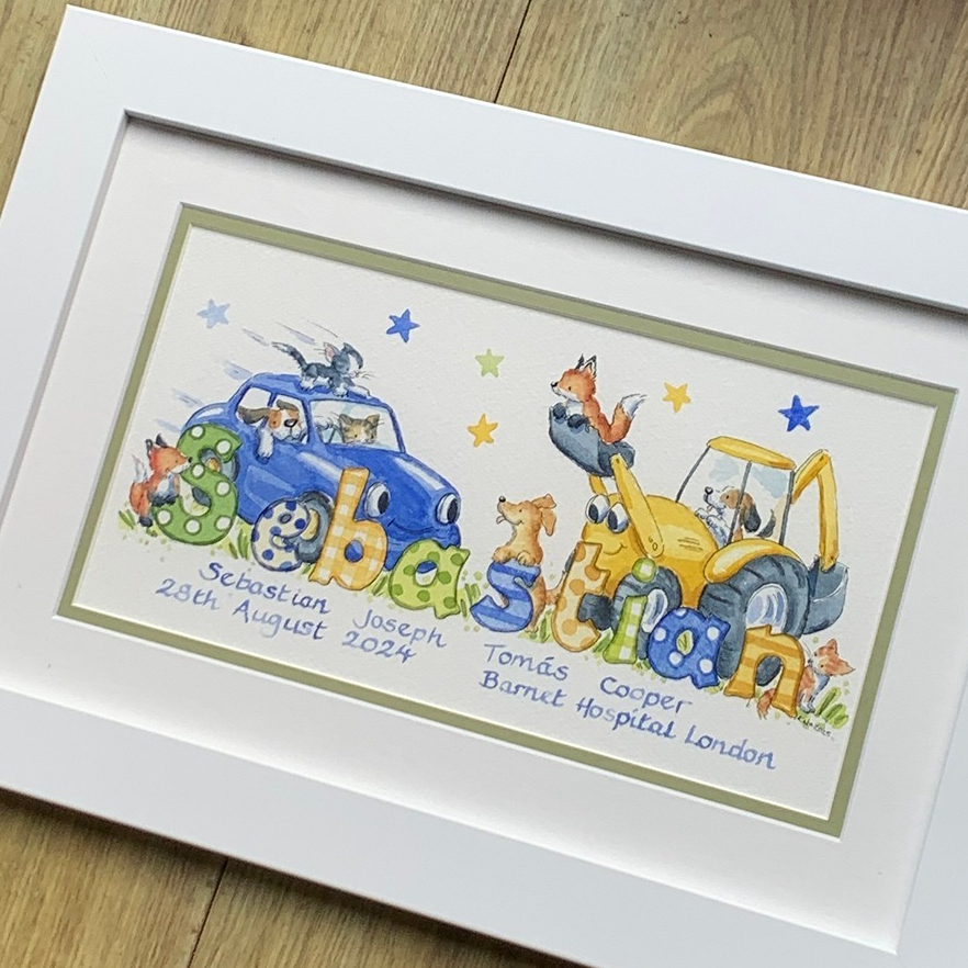 You can choose the vehicles, the colours, and even add tiny drivers (a child in the cab, Mum or Dad at the wheel, a favourite teddy riding shotgun). The finished piece keeps that traditional storybook feel—made to be kept, not replaced.
