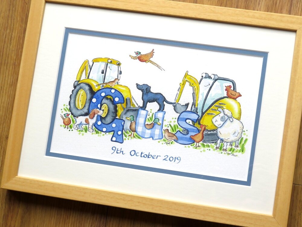 A lovely choice for farming families or little ones who pause for every passing tractor, this design makes a timeless personalised baby gift or keepsake.
